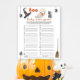 Apresentando uma aquarela fofinha de fantasma bebê e estética de Halloween. Um pouco de bu está quase a chegar! Chá de fraldas temático do Halloween com fantasma de aquarela, gato preto, chapéu de bruxa, esfregão mágico, aranha pendurada numa teia. O pequeno fantasma está comendo um pirulito.