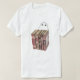 Camiseta fofinha com uma pilha de livros antigos com um fantasma espiante atrás deles.