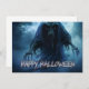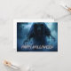 Um fantasma negro flutuante, com uma forma etérea, cercado por densas nuvens de neblina, pairando ameaçadoramente acima do chão, em uma paisagem escura e infernal com uma atmosfera estranha. Feliz Dia das Bruxas
