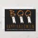 Fantasmas bonitos, modernos, negros, cor de laranja, carta lisa Happy Halloween mostrando três fantasmas brancos bonitos segurando a palavra "BOO", a frase "Feliz Halloween" em laranja e seu texto personalizado em branco.