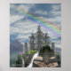 Um lindo castelo sentado no alto das montanhas sobre cascatas gêmeas