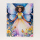 Quebra-cabeça de quebra-cabeça de uma jovem com asas de borboleta, fica em um jardim vibrante, cercado por flores coloridas e estrelas brilhantes. Seu vestido é multicolorido, e ela veste uma coroa de flores em seu cabelo encaracolado.