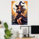 Poster de uma jovem bruxa alegre, com cabelos longos e fluindo, anda uma vassoura em frente a uma lua de cheio grande e brilhante. Os morcegos voam em volta dela, somando a cena noturna encantadora.