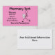 Farmacêutico Farmacêutico Cartões de visitas cor-de-rosa, Artista desenhado pelo 'stick' "corre com receitas". Informações de contato personalizáveis na parte frontal e traseira da placa. A cor de fundo também pode ser alterada pelo comprador.