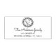 O estilo da fazenda devolve o selo com uma coroa vintage e um esboço de frango no topo, nome da família e endereço de retorno no fundo, em uma fonte decorativa elegante. Procure na nossa loja mais opções de carimbo de fazenda.