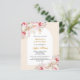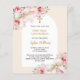 Um quadro de arco branco e um fundo branco bege, cor de pêssego. Decorado com flores cor-de-rosa e arcos de alfinetes. Uma cruz ouro. Personalize e adicione um nome e detalhes. 1 folha = 1 convite impresso de borda a borda.