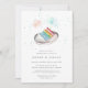Os convites para chás de panela ou chás de casamento festivos apresentam uma fatia de bolo de camada abarrotada de arco-íris, acentuada com aqua confetti e faíscas de aquarela. Personalize com os detalhes do seu chá em letra de cinza.