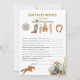 Celebre o seu chá de fraldas com este jogo de desejos de fatos divertidos único, projetado para um Chá de fraldas Derby de Pescador! Este charmoso e rústico jogo da floresta combina fatos divertidos e desejos sinceros, fazer-o como a adição perfeita a qualquer chá de fraldas ou aniversário com um tema de corridas ou pesca de cavalos derby. Apresentando sotaques de ferradura com aquarelas, ícones de pesca e elementos da floresta, este cartão oferece aos hóspedes uma forma memorável de compartilhar suas esperanças com o bebê. Ideal para chás neutros em termos de gênero, este cartão de desejos inspira-se na estética do país e da floresta, com uma vintage, uma reviravolta de feto. Perfeito para festas de inspiração derby, aniversários, e encontros especiais com um toque rústico e elegante, este é um imperativo para o Kentucky Derby, a pesca e os eventos temáticos da floresta.