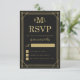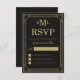 Cartões RSVP de casamento de folha de ouro falsa. As elegantes cartas de RSVP de casamento apresentam uma falsa borda de arte dourada deco, fundo de cinzas escuras e monograma de casamento. Altere o estilo da fonte clicando no botão "Personalizar".