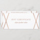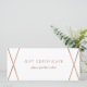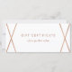 Este certificado de presente moderno, na moda, apresenta um fundo branco com um design geométrico de aparência de rosa dourado falso. A parte de trás contém bastante espaço para você se personalizar totalmente com suas informações de loja ou de empresa.