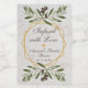 Esta etiqueta de lembrancinha de chá de panela com azeite de oliva tem uma moldura geométrica irregular dourada com ramos de oliveira com folhas verdes e azeitonas pretas para cima e para baixo sobre dois hexágonos dourados que se sobrepõem. O fundo é de mármore branco. A mensagem "Infundido com amor" e o nome e ocasião são escritos em uma elegante fonte caligráfica; o restante é escrito em letras maiúsculas. Há um coração dourado (falso) acima dos nomes.