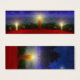 Uma cena de Natal tridimensional criou em Vue, com velas colocadas em vermelho em frente à garland de pinheiro acentuadas com ornamentos de vermelho e ouro. No fundo de neve estão árvores de abeto azul-esverdeado contra um céu fractal girando coberto por estrelas. Uma estrela brilhante solteiro domina o céu noturno.