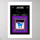 Bonita, Colorida, e tão Whimsical. "Aries the Ram" Poster de 12" x 18" feito em um estilo de desenho animado super adorável. Encontramos nosso personagem de desenho animado azul, amigável, Ram, que tem apenas os chifres coloridos pendurados na neve sob um céu noturno estrelado. Acima das camadas de armações muito elaboradas, para incluir bolinhas, triângulos e listras em cores de roxo sólido, listras pretas com bolinhas brancas, faixa fina e roxa, faixa azul ligeiramente mais espessa, faixa roxa com bolinhas brancas, faixa sólida laranja, triângulos alternados azul e amarelo e terminando com uma faixa rosa, estão as avarias da constelação. Nos cantos estão alternadamente sóis e luas. No topo estão outro sol e lua em ambos os lados do Título da obra de arte - "ARIES"