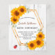 Para uma festa de aniversário de 50ª (ou qualquer idade). Um fundo de madeira branco rústico, decorado com girassóis. Um falso quadro geométrico dourado e uma bela joaninha vermelha. Personalize e adicione o nome, a idade e os detalhes da festa na frente.