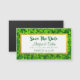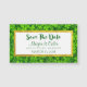 Um cartão de visita magnético com um casamento, salve o design. Um campo de folhas de trevo verde. Estas lindas plantas têm gotas de água por todas elas dando-lhes uma nova aparência de primavera.Personalize com o nome da noiva e do noivo e sua data de casamento. Design para um casamento na primavera.