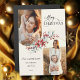 Sua saudação de fotos de feriado fará uma impressão duradoura com este design único com dois modelos de fotos em forma de arco (trabalhos verticalmente melhores) com bordas douradas, um encantador spray de cor d'água botânica de inverno em vermelho e verde, gráfico personalizado de texto "Feliz Natal" em uma elegante fonte de caligrafia e campos de texto editáveis em um fundo buff. A cor do gráfico de texto pode ser alterada no editor de design.