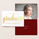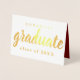 Um cartão de saudação de graduação em folha, ousado e metálico, com tipo personalizável na frente. O interior permite uma foto do cliente que é removível se preferido e uma mensagem personalizada digitada. A cor de fundo interior também pode ser editada para corresponder às cores da escola do seu formando.
