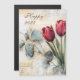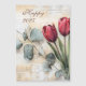 O calendário exibe um design de safra com um fundo de madeira em apuros e uma cobertura de script. Duas tulipas vermelhas e folhas de eucalipto adicionam um toque de natureza e elegância. O ano "2025" e a palavra "Happy" aparecem em escrituras decorativas. Se você é novo no Zazzle, estou feliz em ajudá-lo a personalizar seu design. Não hesite em entrar em contato comigo em daed.halabi@gmail.com