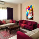 Um bolo de aniversário com velas e cães com chapéu de aniversário e balões ao fundo. Esta é uma arte gerada por IA.