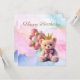 Um bonitinho ursinho de pelúcia com arco rosa e coroa dourada Feliz Aniversário