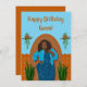Essa design apresenta uma beleza afro-americana curvada com jaqueta azul e vestida em uma parede colorida terra cotta com plantas e fundo azul. Personalize o dentro de mensagem.