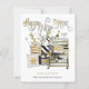 Um preço orçamentário Cartão simples MAIS PEQUENO de 4,5" x 5,6" para as saudações do seu novo ano em um estoque de cartão SEMI GLOSS 110 lb brilhante (semelhante à espessura de um cartão postal). OBSERVE: O envelope fornecido com este cartão é ligeiramente maior que o próprio cartão. Feliz ano novo de Script Dourado Luminter Preto. Saudações efêmeras para sua família e amigos com este design de brilho e brilho em preto elegante e ouro com Feliz ano novo em um conjunto de roteiro decorativo faux glitter e uma imagem cheia de itens comemorativos, champanhe, presentes e partyware. Personalize facilmente a sua saudação e os seus nomes no fundo.