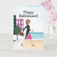 Um cartão divertido e humorístico para uma colega de trabalho que se aposenta no seu local de trabalho, desejando-lhe uma feliz aposentadoria, com um tema de férias. O conceito design mostra uma empresária deixando a cidade da vida profissional e entrando em férias numa praia.