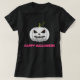 Uma camiseta de Halloween para mulheres na moda, com uma abóbora assustadora e uma inscrição "Feliz Dia das Bruxas". Perfeito para festas ou apenas para adicionar uma vibração festiva ao seu armário de outubro. Confortável e versátil, esta t-shirt facilita celebrar esta estação assustadora em estilo.