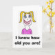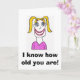 Feliz Cartão de Aniversário para Garota. Lá fora lê: "Eu sei quantos anos você tem!" A dentro diz, "E eu vou contar! Feliz aniversário!"