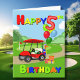 Ampliando a cena do aniversário, um carrinho de golfe vermelho brilhante traz entusiasmo e alegria! À frente, senta-se um bolo festivo com tema de golfe, enquanto as costas estão empilhadas com presentes coloridos e balões saltados com um balão gigante número 5. Com um texto de cor primária ousado, este cartão é perfeito para celebrar o dia especial de um menino.