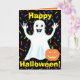 BOO! Um fantasma feliz inventa esta divertida carta de saudação de Halloween. Personalizável para que você possa adicionar seu próprio texto e alterar a cor de fundo. Mostre seu espírito de Halloween com esta design divertida!