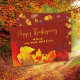 Feliz cartão de saudação de Ação de Graças com opção de download. As folhas de queda realistas fazem uma borda em amarelo, vermelho e laranja ao longo da base das placas planas. O guião manuscrito em amarelo é "Feliz Ação de Graças" com texto impresso em negrito abaixo da assinatura. A cor de fundo é enferrujada, marrom-vermelha e as folhas carregares para o fundo e fazem um padrão. O download deste design pode ser compartilhado digitalmente no feriado.