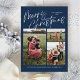 O Cartão Magnético de Foto de Natal Merry Azul apresenta um roteiro calítico moderno na frente, juntamente com três fotos, e uma xadrez de Natal festiva nas costas.
