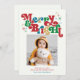 Estes cartões de natal retrorreflectores de 5" x 7" apresentam uma saudação brilhante e colorida, "Feliz e Brilho", em vermelho, verde, azul e ouro, e uma saudação editável, "Desejando paz, amor e alegria para você nesta temporada de feriado", com um espaço reservado para sua foto favorita, e seu(s) nome(s) de família.