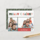 Cartão com fotos de Natal com orçamento colorido para famílias apresenta duas das suas melhores fotos de família, destacadas por "Feliz e Brilho" em letras brancas e multicoloridas. Personalize com seu nome e o ano. As cartas se invertem a um padrão divertido da árvore de Natal em um fundo verde sábio.