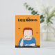 Feliz Dia das Bruxas Frankenstein com cabelo vermelho e camisa azul e aranhas amigáveis em todo lugar cartão postal.
