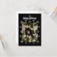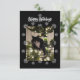Feliz Dia de Férias. Um gato Tuxedo numa árvore de Natal. Fundo preto.