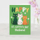 Este cartão mostra três gatos estilizados enfileirados em um fundo verde-esmeralda profundo, seus corpos dispostos em uma fileira horizontal constante que parece próxima e companheira 💚. À esquerda, senta-se um gato verde-floresta com olhos amarelos intensos, inclinado ligeiramente para o centro como se estivesse fazendo companhia aos outros. No meio, um gato branco está pontilhado com pequenas formas de trevo, e seu rosto calmo parece encontrar o olhar do gato da esquerda de uma maneira silenciosamente afetuosa ☘️. À direita, um gato laranja-avermelhado completa o trio com um sorriso suave que combina com o clima amigável do grupo. Trevos brancos flutuam ao redor deles como confetes leves, preenchendo o espaço sem amontoar os gatos. Perto do topo, “FELIZ” aparece em letras arredondadas, alternando entre verde-claro, laranja e branco ao longo da palavra. Ao longo da parte inferior, “DIA DE SÃO GAT