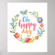 O impressão poster floral colorido do Dia Feliz apresenta a tipografia moderna escrita à mão em rosa azul e laranja dentro de uma bela coroa floral.