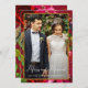 Linda cor vermelha-de-água-burguesa-escura floral e verde com feliz elegante e caligrafia casada, cartões de natal de Natal, mostra a foto do novo casal e seu nome em texto branco simples, e um impressão floral impressionante e festivo na parte de trás do cartão.