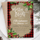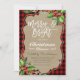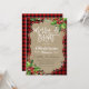 Convite de festas de Janto de Natal feliz e Brilho com tema de lenhador e fundo de xadrez de búfalo vermelho. Perfeito se você está planejando uma festa de Natal rústica.