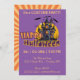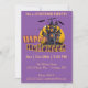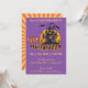 Este design de Feliz Halloween fofo e caprichoso irá deliciar crianças de todas as idades. Ele apresenta uma casa assombrada por bobo com um fantasma acima dele. O design verde e laranja mostra arte vocal que diz Feliz Halloween, tudo num fundo roxo estrelado. Esta design bonita é excelente de convidar para uma festa especial do Halloween, uma festa de aniversário do Halloween, uma festa temática como uma festa de fantasia. Personalize com os detalhes da sua parte para fornecer aos seus convidados informações sobre a parte, a data, o local, etc.