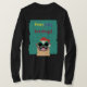 Um design de Natal com um cachorro vestindo chapéu de Natal e óculos de sol e texto amarelo, roxo e marrom Happy Jolly Saudações! slogan com árvores de Natal verdes.