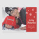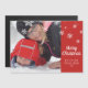 Cartão de imã festivo de Natal com modelo fotográfico. O fundo é vermelho, flocos de neve brancos sobrepõem a foto. Insira sua foto favorita no modelo. Você pode personalizar o texto Feliz Natal, saudações pessoais com nomes e um número de ano. O texto está em um script manuscrito branco de tendência.