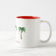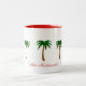 A caneca de café mostrada no branco com vermelho para dentro, com as palmeiras de um feriado imprime. O texto diz o Feliz Natal em Mele havaiano Kalikimaka. Personalize esta caneca ou compre-a como é.