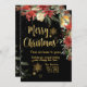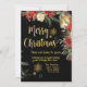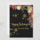 Um cartão de Natal elegante e elegante com um lado e um cartão semidiâmico de 5 por 7 polegadas. Um fundo preto clássico com flores vermelhas de férias e verde verde-verde com caligrafia manuscrita em ouro e um borrão de flocos de neve delicados, desejando aos seus hóspedes um feriado e feliz ano novo alegres. A parte de trás do cartão diz Feliz Feriado com seu nome de família.