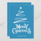 Feliz Natal na fonte decorativa com estilo de escrita com um esboço de uma árvore de Natal e estrela no design. Este cartão de Natal de cor de fundo azul foi projetado para que você possa mudar a cor do plano de fundo e também digitar seu nome de família.