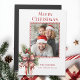 Design festivo e divertido com um molde fotográfico em uma armação de cana doce com um buquê de santo de inverno e verde amarrado com um arco listrado de cana doce. Apresenta saudação Feliz de Natal em uma fonte personalizada exclusiva.