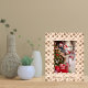 Um quadro fotográfico gravado bonito com um padrão de árvore de natal e "natal alegre" no fundo. Para alterar ou remover o texto, clique no botão personalizar. Contém IA