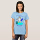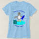 Esta camisa apresenta uma cinza e um pinguim branco bonitinho com olhos escuros e bico e pés amarelos. O pinguim está segurando um peixe grande azul com uma nadadora e parado em um pedaço azul pálido de gelo. Há um presente aberto ao lado do pinguim completo com uma fita festiva.